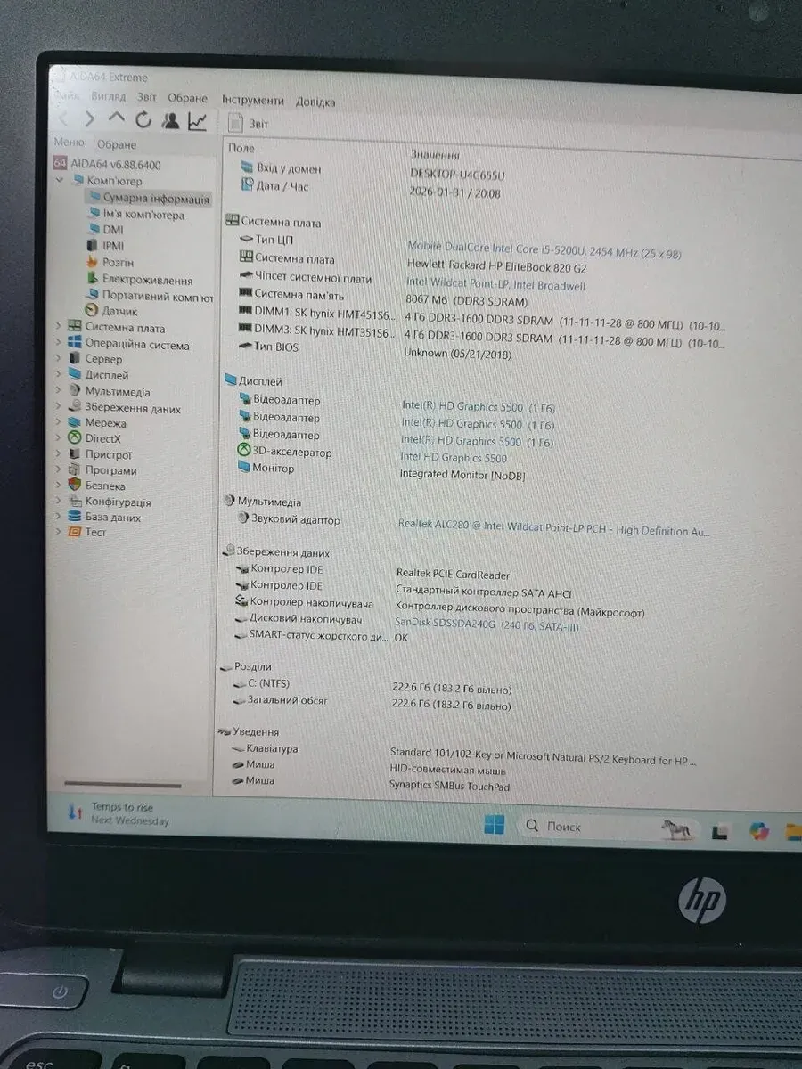 - Процесор: Intel Core i5-5200U (2 (4) ядра з тактовою частотою 2,2–2,7 ГГц), 3 МБ Smart Cache