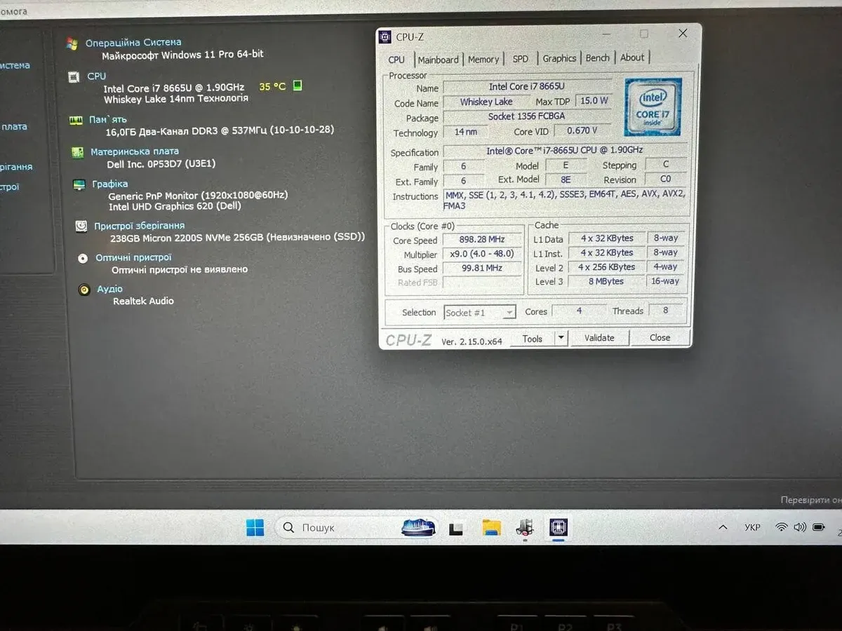 - Процесор: Intel Core i7-8665U (4 (8) ядра по 1.9 - 4.8 GHz), 8 MB Smart Cache