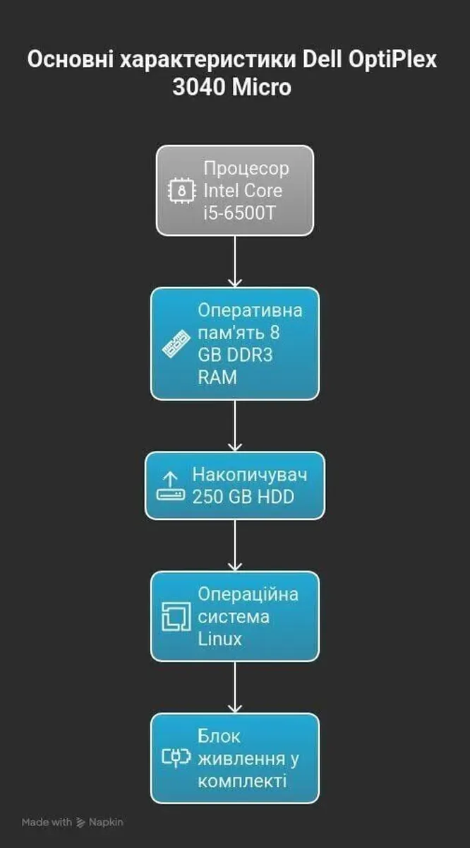 - Процесор: Intel Core i5-6500T (4 ядра з тактовою частотою 2,5–3,1 ГГц), 6 МБ Smart Cache