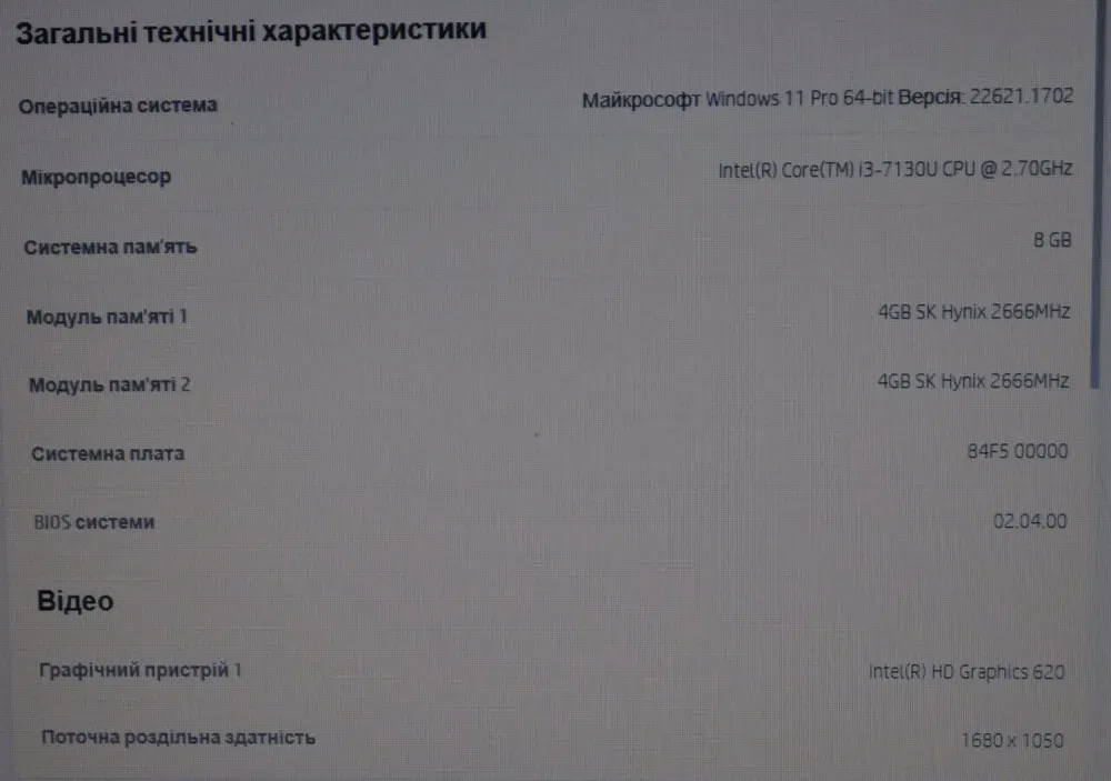 - Процесор: Intel Core i3-7130U (2 (4) ядра по 2.7 GHz), 3 MB Smart Cache