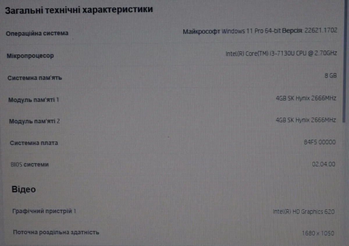 - Графіка: інтегрована Intel HD Graphics 620 (до 1792 МБ з ОЗУ)
