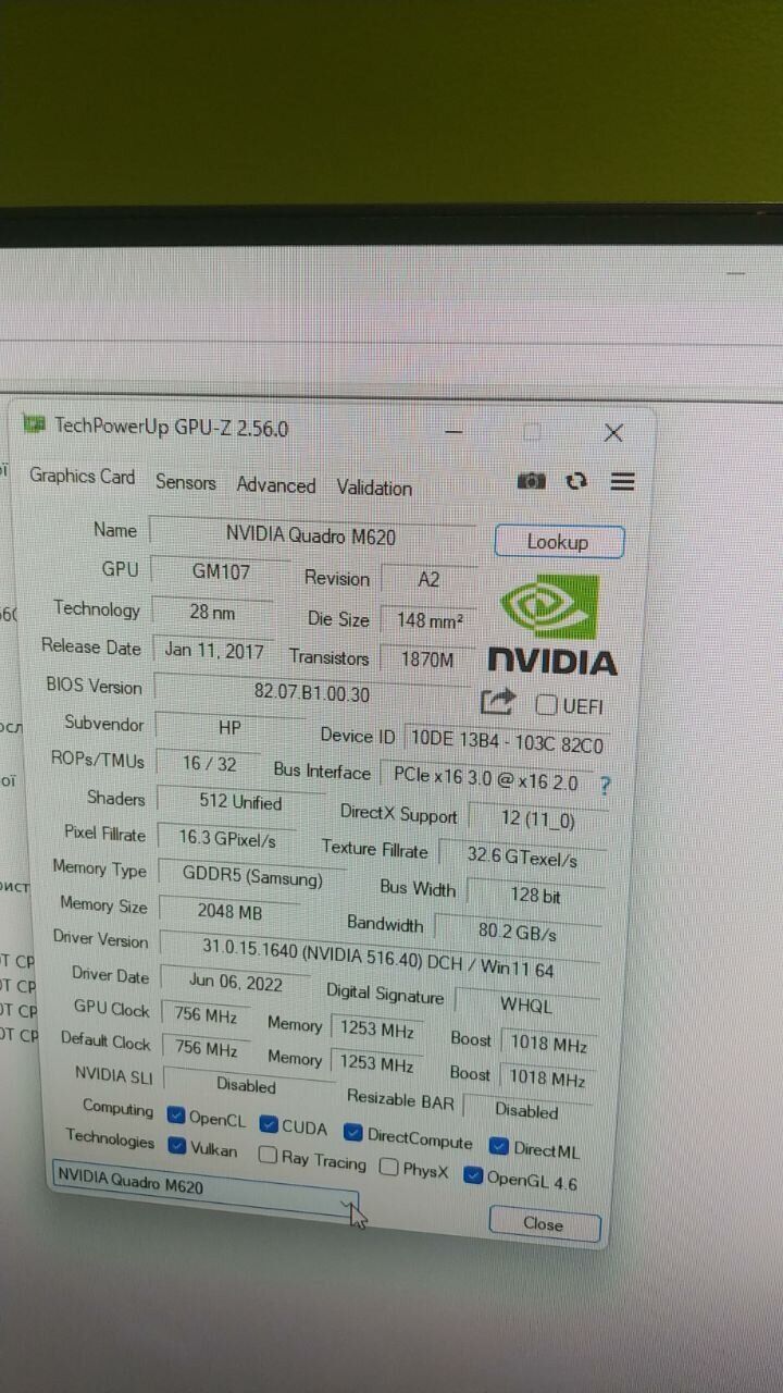 - Графіка: дискретна nVidia Quadro M620, 2 GB GDDR5, 128-bit