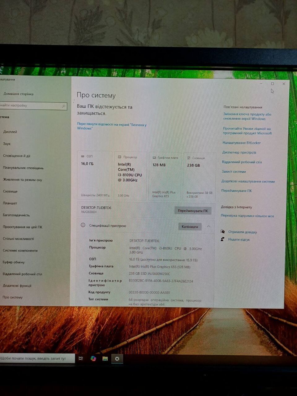 - Процесор: Intel Core i3-8109U (2 (4) ядра з тактовою частотою 3,0–3,6 ГГц), 4 МБ Smart Cache