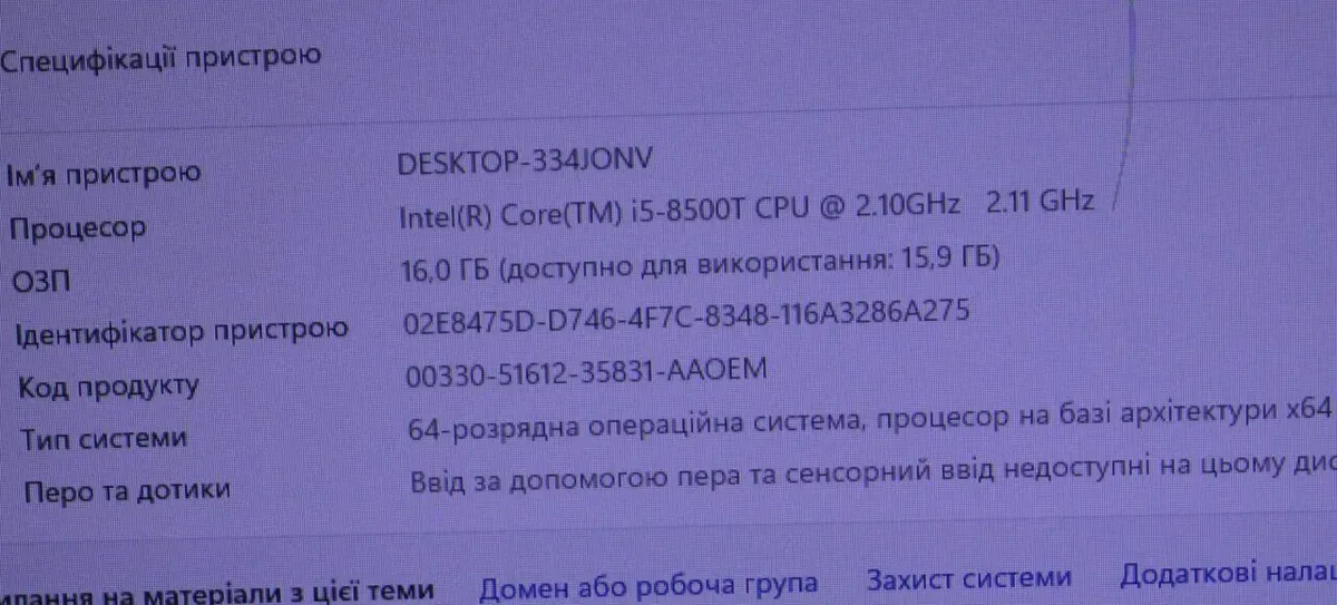 - Процесор: Intel Core i5-8400T (6 ядер по 1.7 - 3.3 GHz), 9 MB Smart Cache