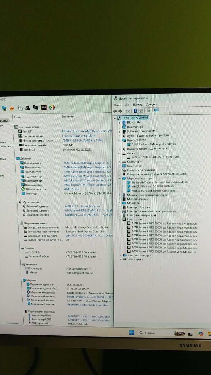 - Процесор: AMD Ryzen 5 3500U (4(8) ядра по 2.1 - 3.7 GHz), 4 MB Cache