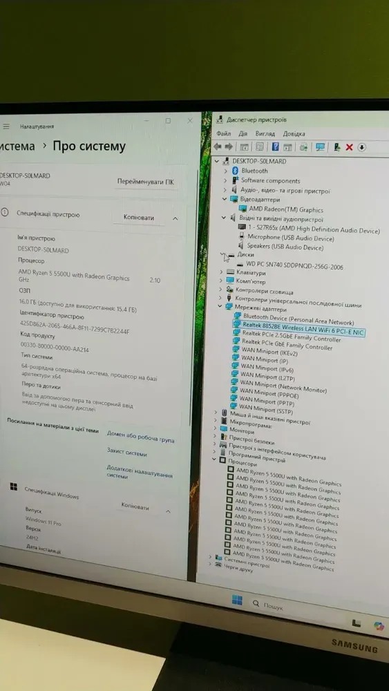 - Процесор: AMD Ryzen 5 5500U (6 (12) ядер по 2.1 - 4.0 GHz), 8 МБ Smart Cache