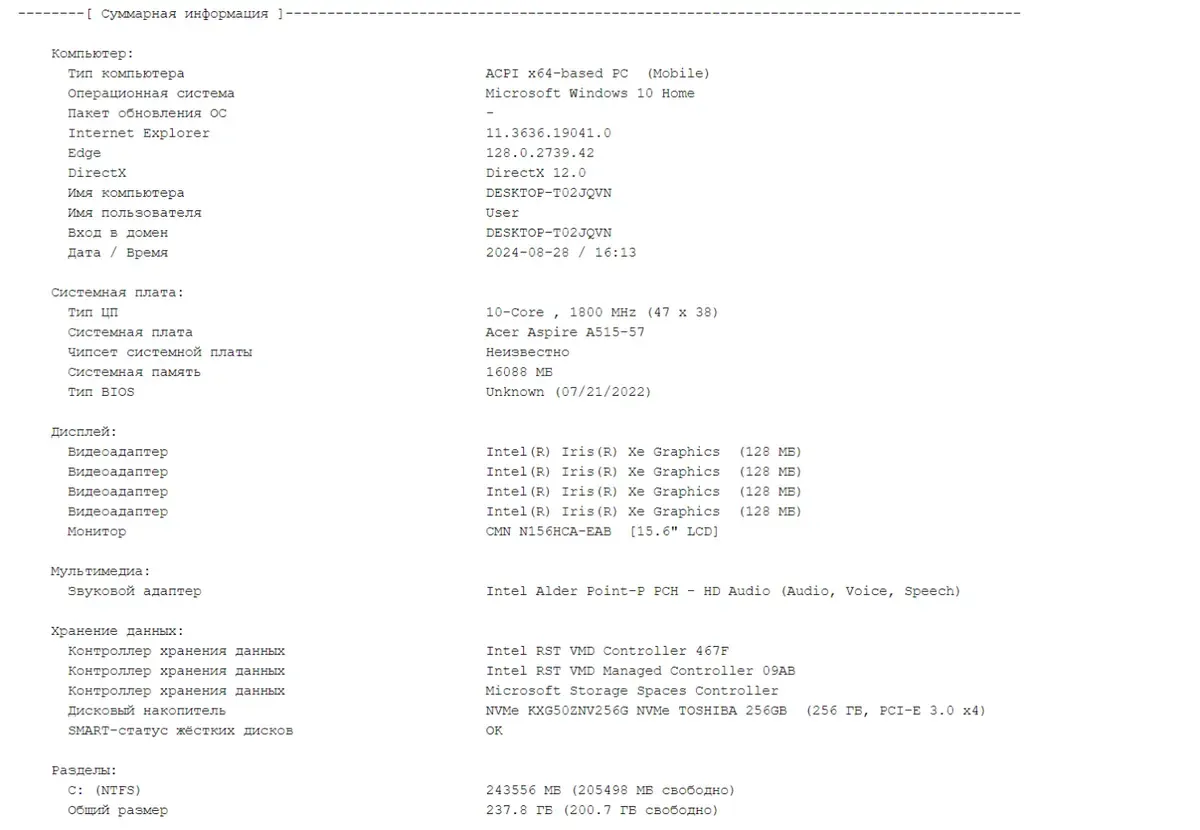 - Постійна пам'ять: 256 GB SSD M.2 NVMe (Toshiba KXG50ZNV256G, PCI-E 3.0 x4)