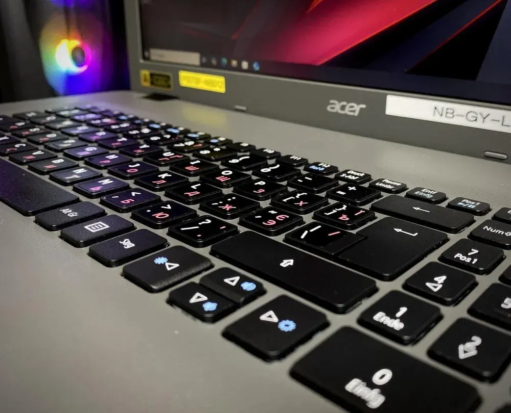 - Комплектація: ноутбук, зарядний пристрій, наклейки на клавіатуру