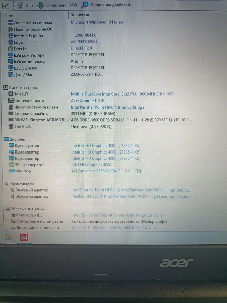 Ноутбук Acer Aspire E1-570G з екраном 15.6" (1366x768) TN на базі процесора Intel Core i3-3217U та оперативною пам'яттю 4 GB DDR3 для офісної роботи та домашніх завдань
