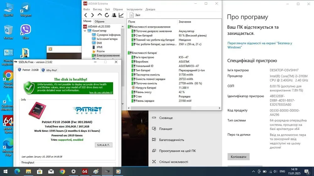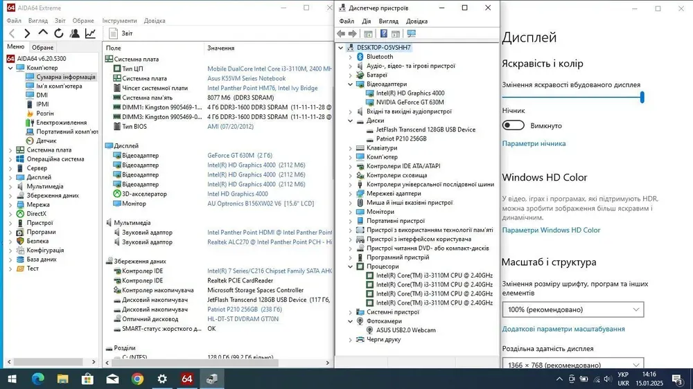 - Процесор: Intel Core i3-3110M (2(4) ядра по 2.4 GHz); Cache Memory 3 MB