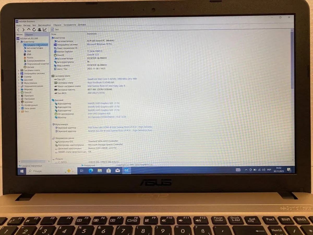 - Процесор: Intel Core i5-8250U (4 (8) ядра з тактовою частотою 1,6–3,4 ГГц), 6 МБ Smart Cache