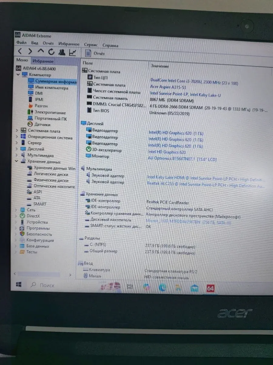 - Процесор: Intel Core i3-7020U (2 (4) ядра по 2.3 GHz), 3 MB Smart Cache