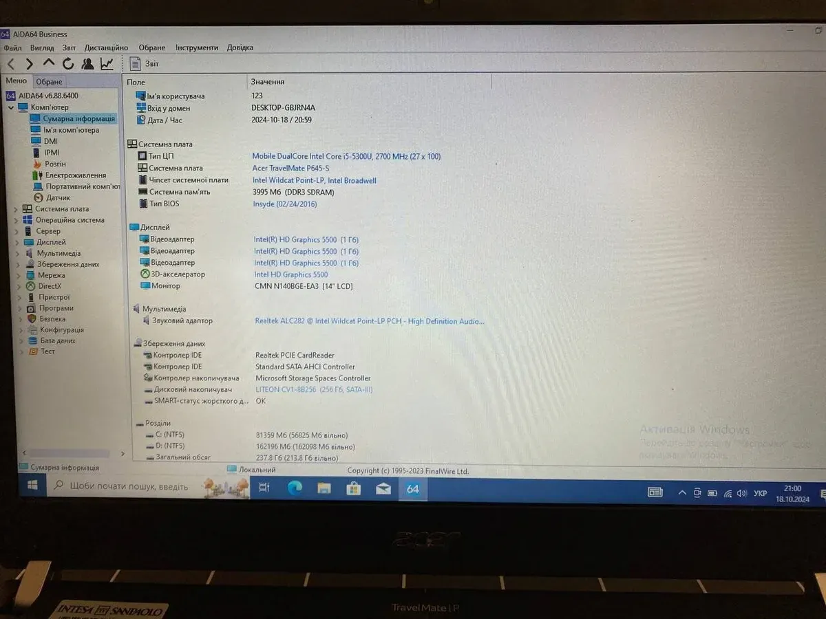 - Модель: Acer TravelMate P645-S