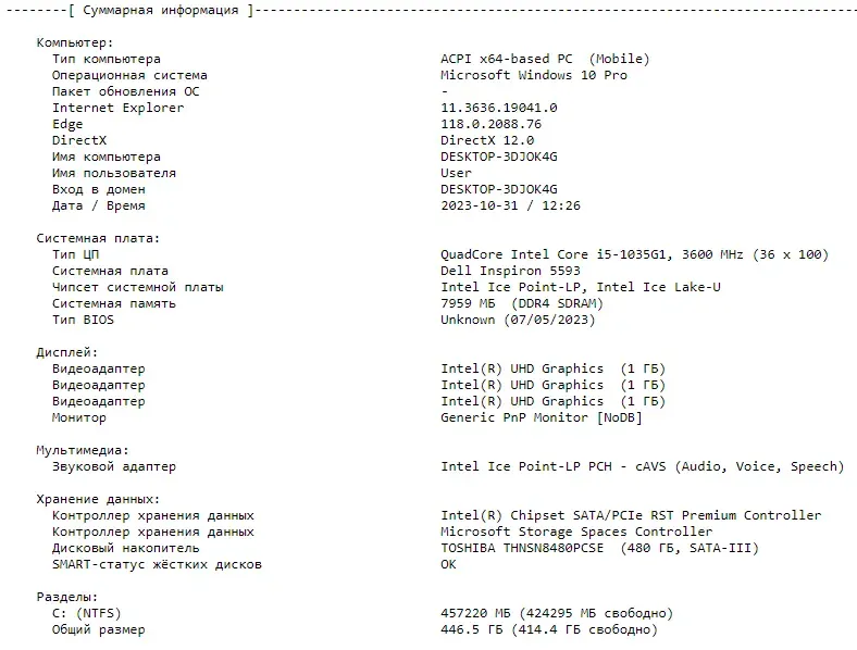 - Постійна пам'ять: 480 GB SSD (Toshiba THNSN8480PCSE)