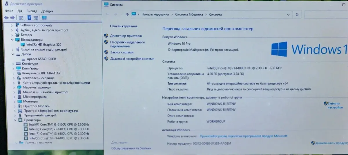 - Процесор: Intel Core i3-6100U (2 (4) ядра по 2.3 GHz), 3 MB Smart Cache
