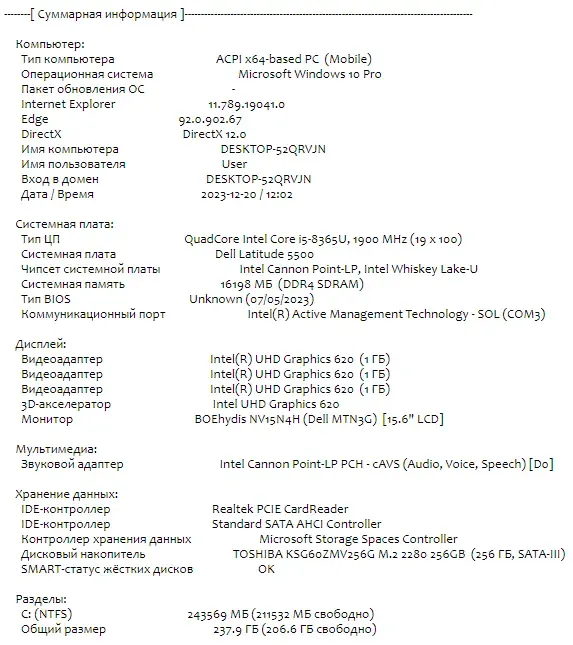 - Постійна пам'ять: 256 GB SSD M.2 NVMe (Toshiba KSG60ZMV256G)