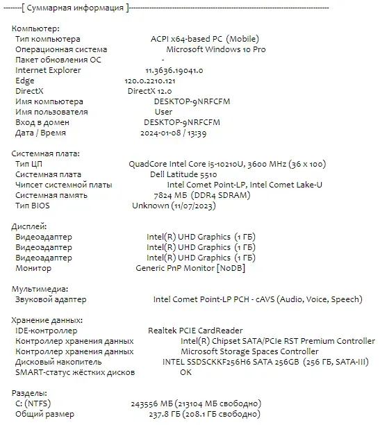 - Постійна пам'ять: 256 GB SSD M.2 (Intel SSDSCKKF256H6)