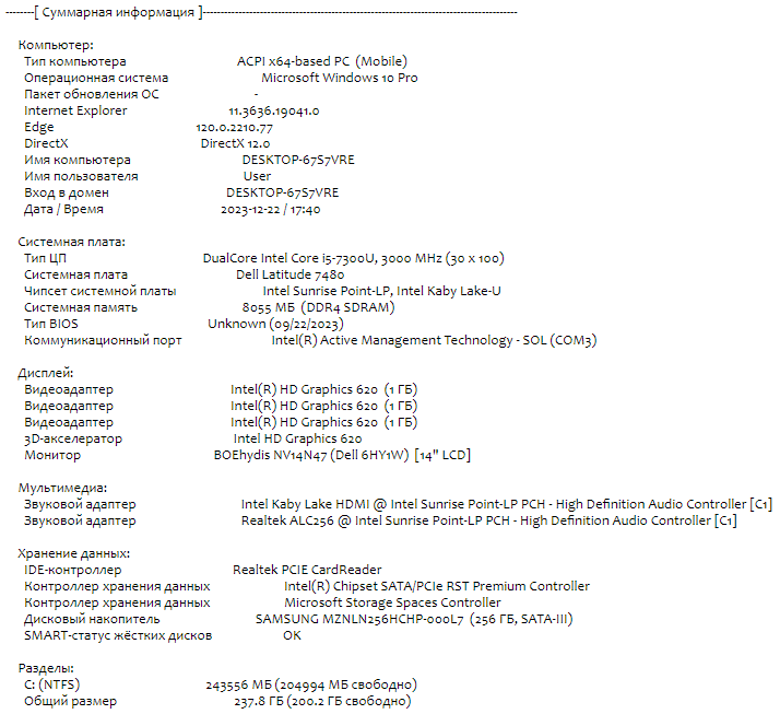 - Процесор: Intel Core i5-7300U (2 (4) ядра по 2.6 - 3.5 GHz), 3 MB Smart Cache