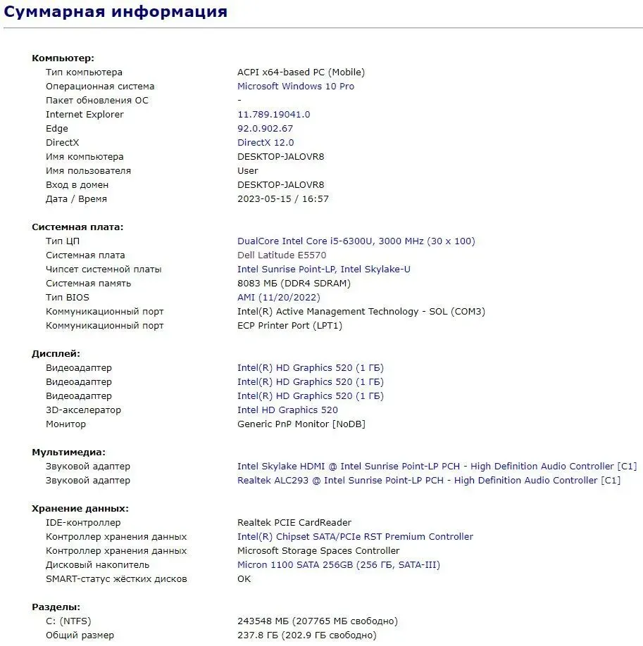 - Процесор: Intel Core i5-6300U (2 (4) ядра по 2.4 - 3.0 GHz); 3 MB Smart Cache