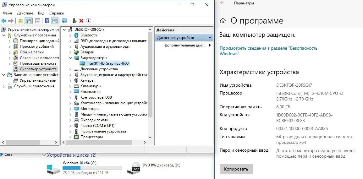 - Процесор: Intel Core i5-4310M (2 (4) ядра по 2.7 - 3.4 GHz), 3 MB Smart Cache