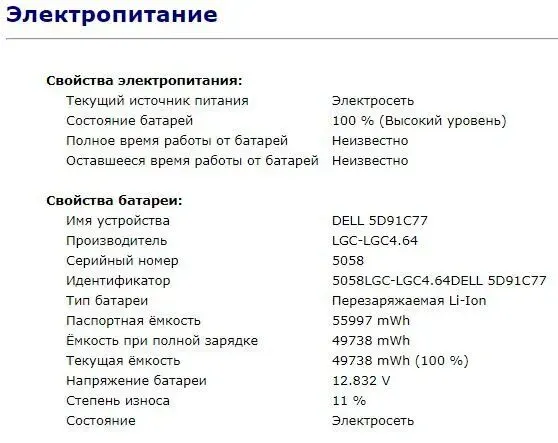 Характеристики батареї:56Whr Lithium Ion polymer. Знос батареї - 11%