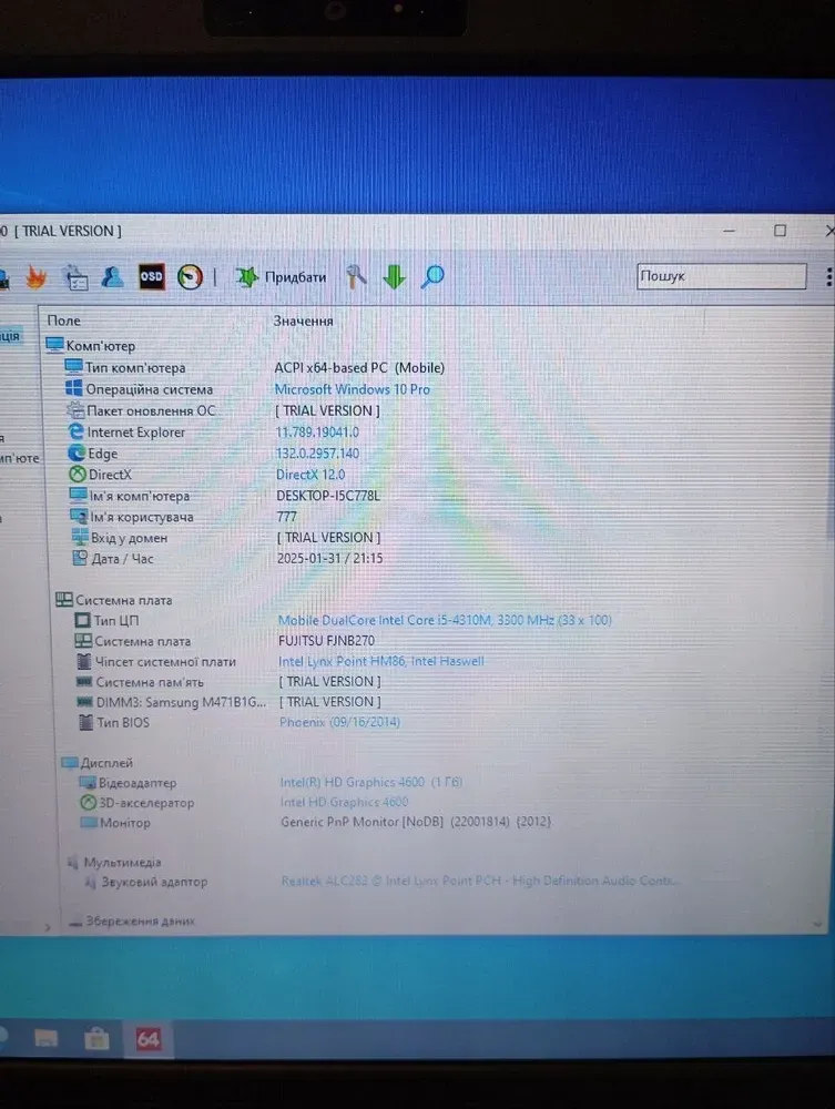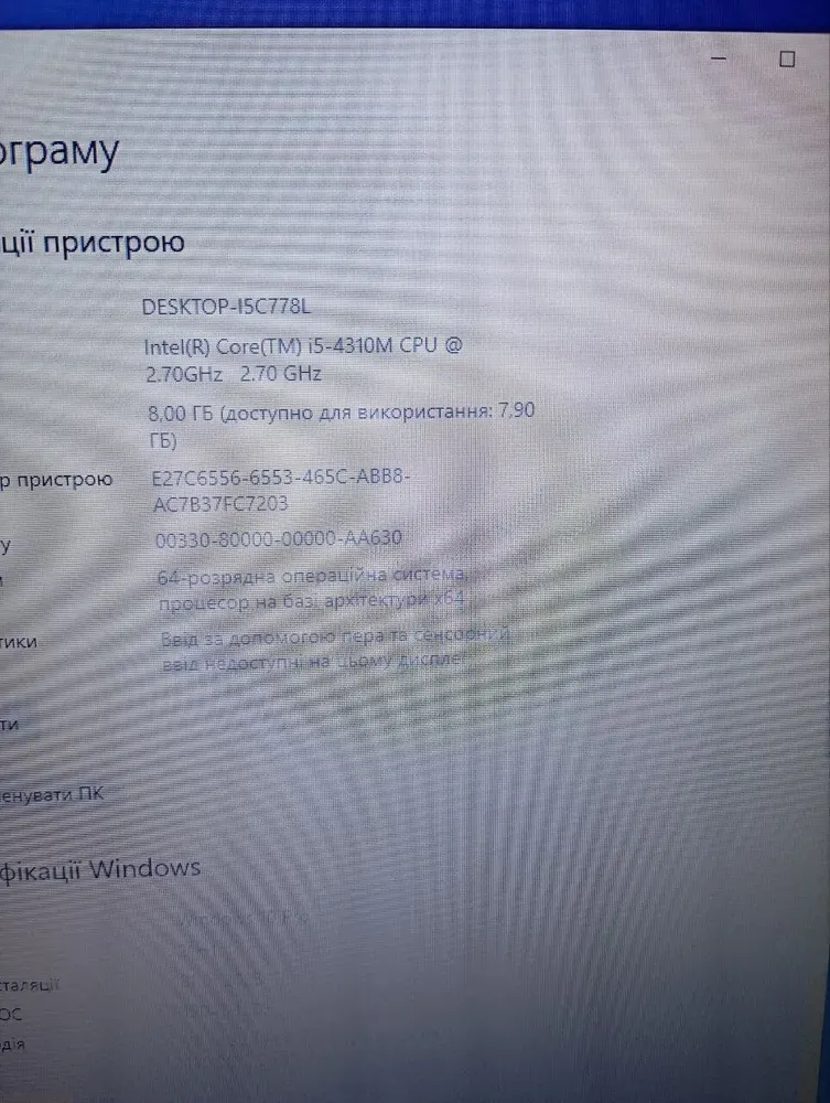 - Процесор: Intel Core i5-4310M (2(4) ядра по 2.7 - 3.4 GHz), 3 MB Smart Cache