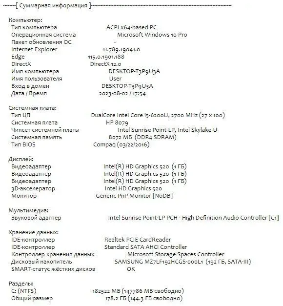 - Постійна пам'ять: 192 GB SSD (Samsung MZ7LF192HCGS-000L1)