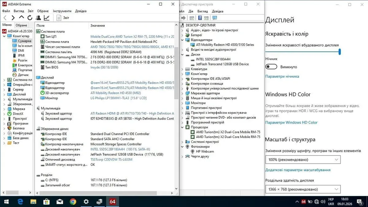 - Процесор: AMD Turion X2 RM-75 (2 ядра по 2,2 ГГц), 1 МБ кеш-пам'яті