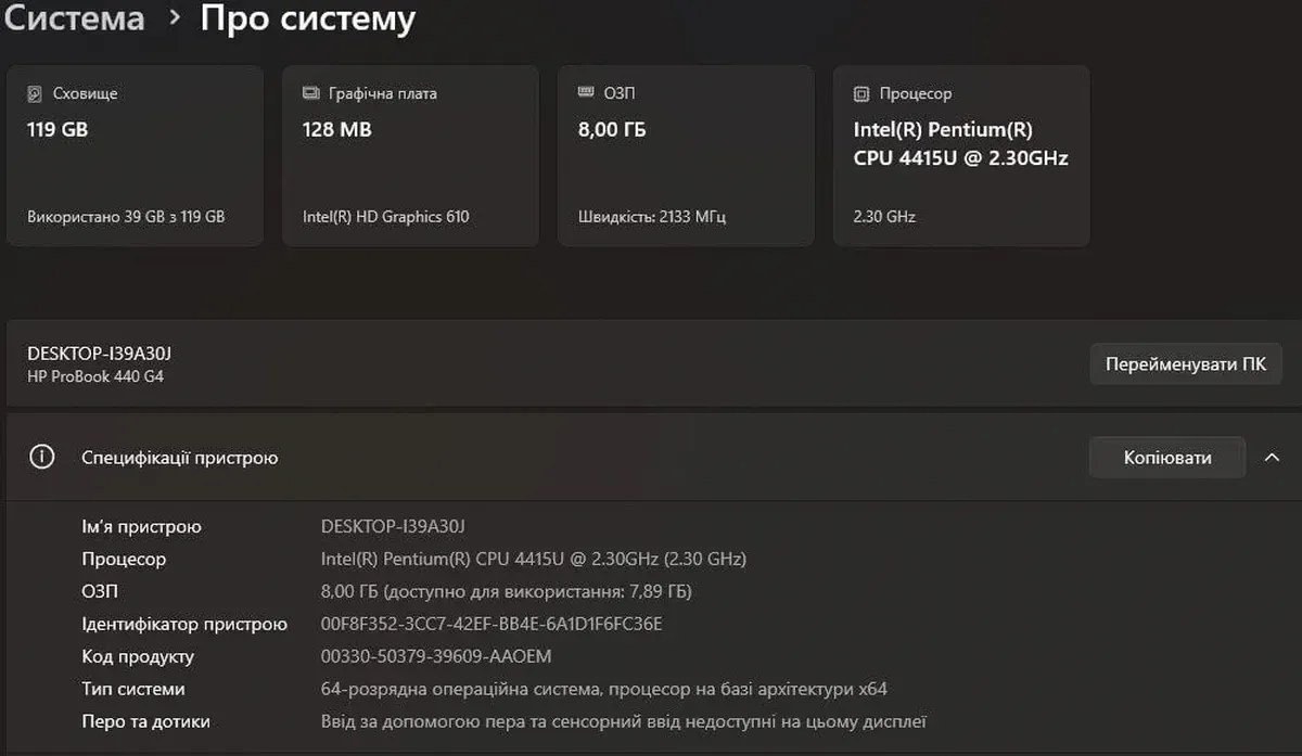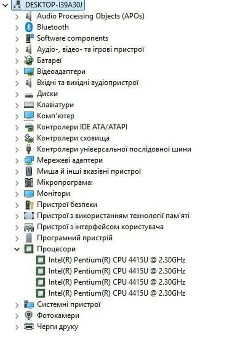 - Процесор: Intel Pentium 4415U (2 (4) ядра з тактовою частотою 2,3 ГГц), 2 МБ Smart Cache