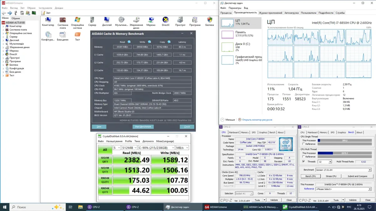 - Процесор: Intel Core i7-8850H (6 (12) ядер з тактовою частотою 2,6–4,3 ГГц), 9 МБ Smart Cache