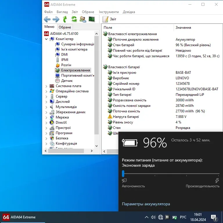 - Батарея: щонайменше 3-3.5 години в режимі звичайного навантаження, знос 4%