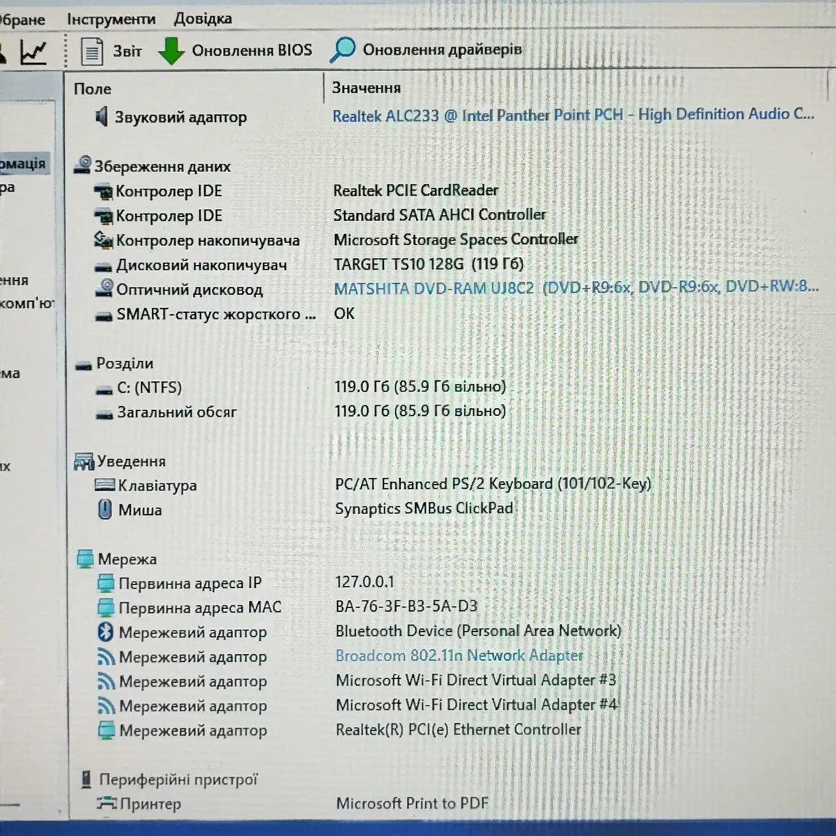 - Процесор: Intel Core i5-3337U (2 (4) ядра по 1.8 - 2.7 GHz), 3 MB Smart Cache
