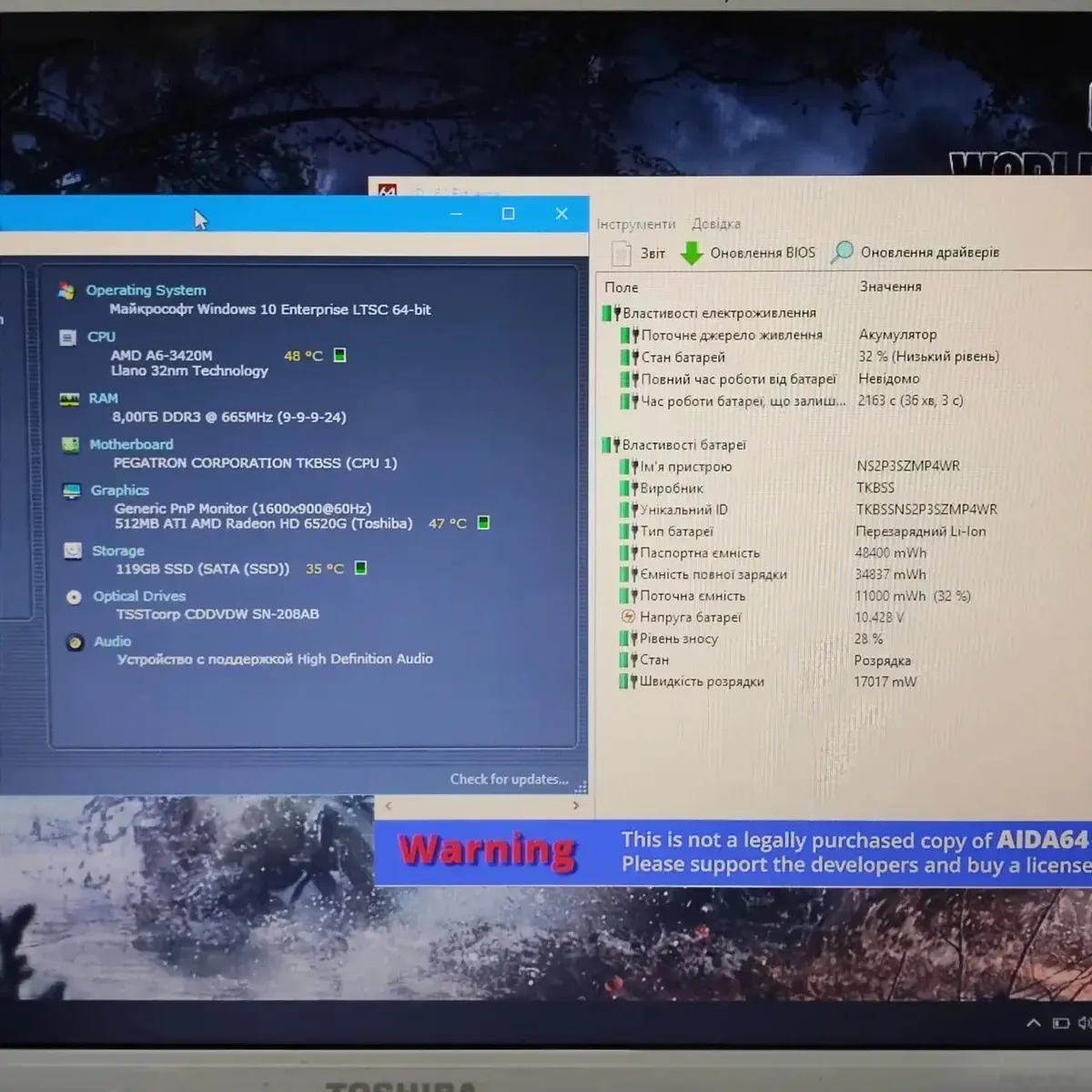 - Процесор: AMD A6-3420M (2 (4) ядра по 1.5 - 2.4 GHz), 1 MB Cache