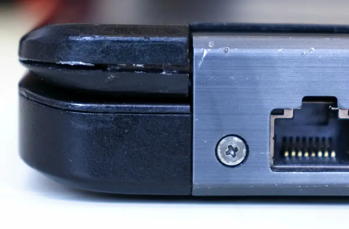 - Подряпини та потертості на верхній кришці. Пошкодження пластика біля правої петлі - видно ззаду. Тріщина рамки екрану - зліва вгорі