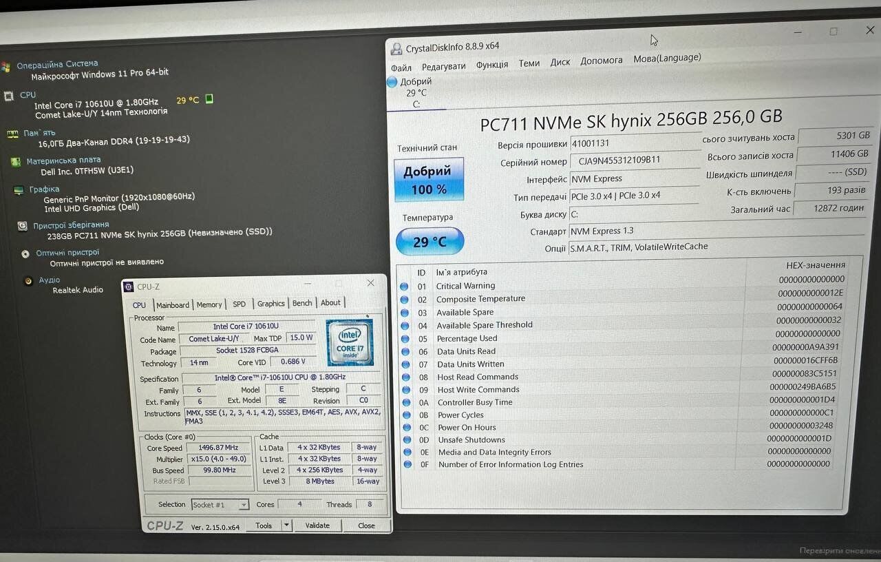 - Процесор: Intel Core i7-10610U (4 (8) ядра по 1,8–4,9 ГГц), 8 МБ Smart Cache