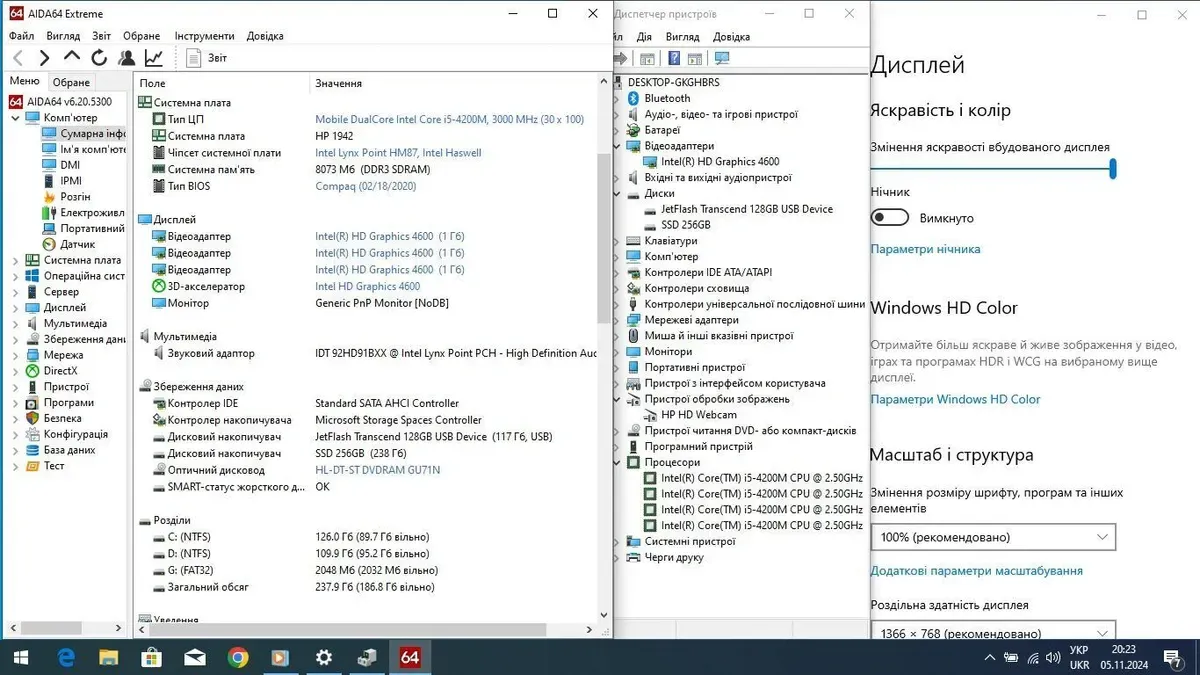 - Процесор: Intel Core i5-4200U (2 (4) ядра по 1.6 - 2.6 GHz), 3 MB Smart Cache
