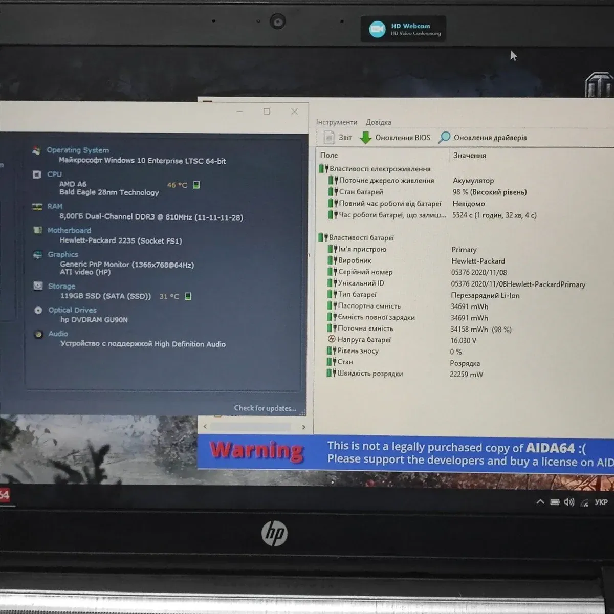 - Процесор: AMD A6 Pro-7050B (2 ядра по 2.2 – 3.0 GHz), 1 MB Cache
