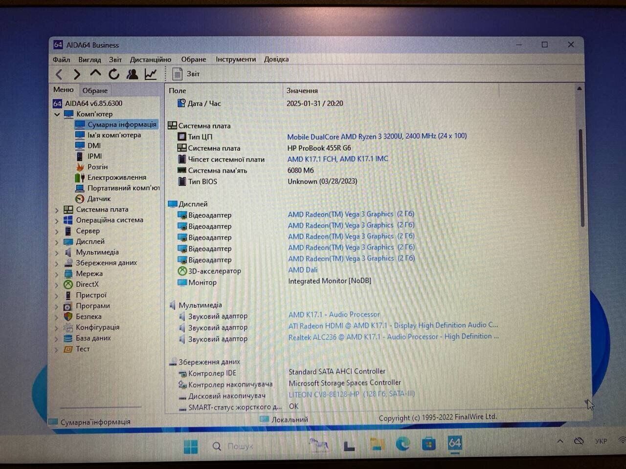 - Процесор: AMD Ryzen 3 3200U (2 (4) ядра по 2,6 - 3,5 ГГц), 4 МБ кеш-пам'яті