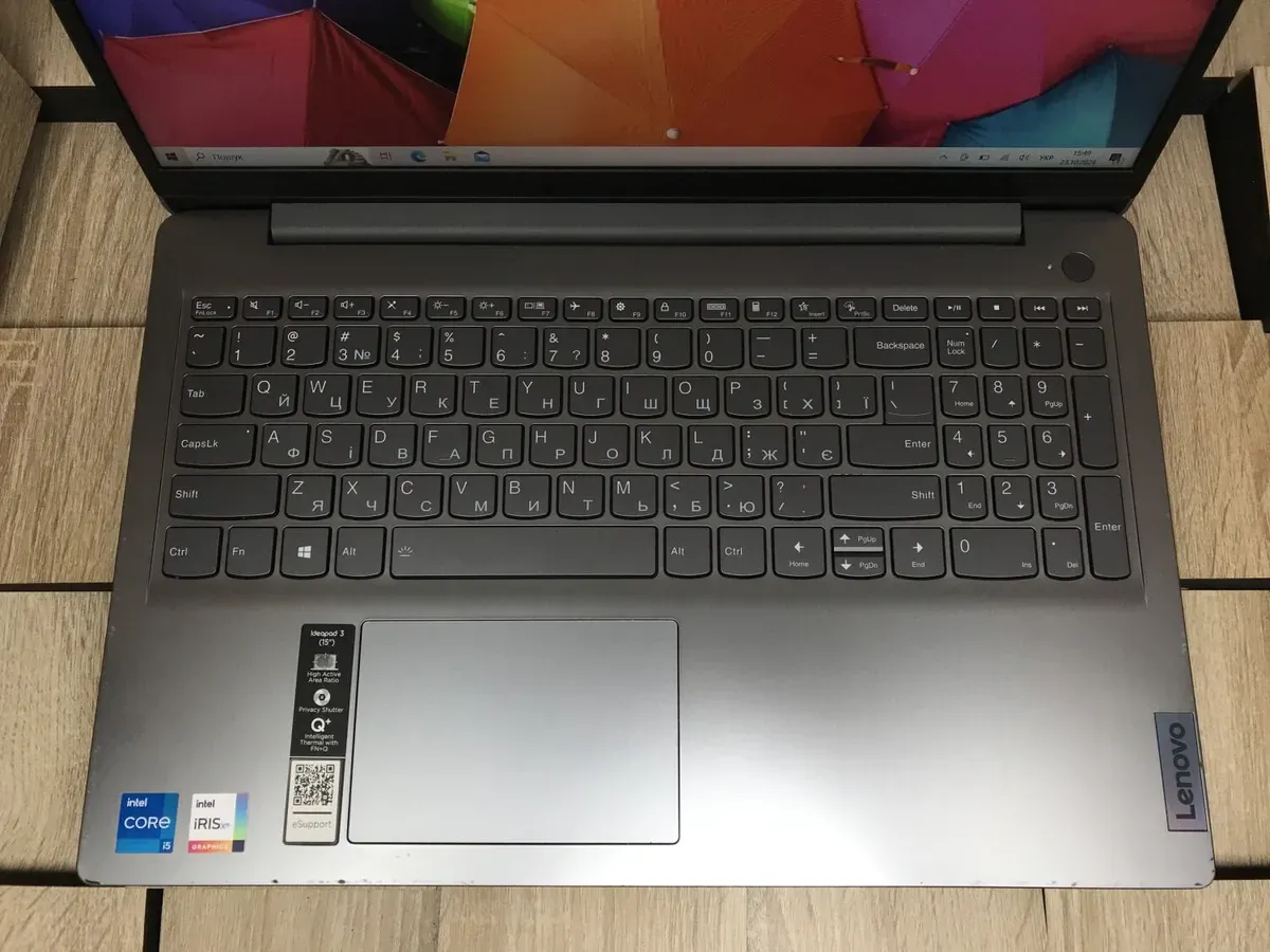 - Комплектація: ноутбук, зарядний пристрій, наклейки на клавіатуру