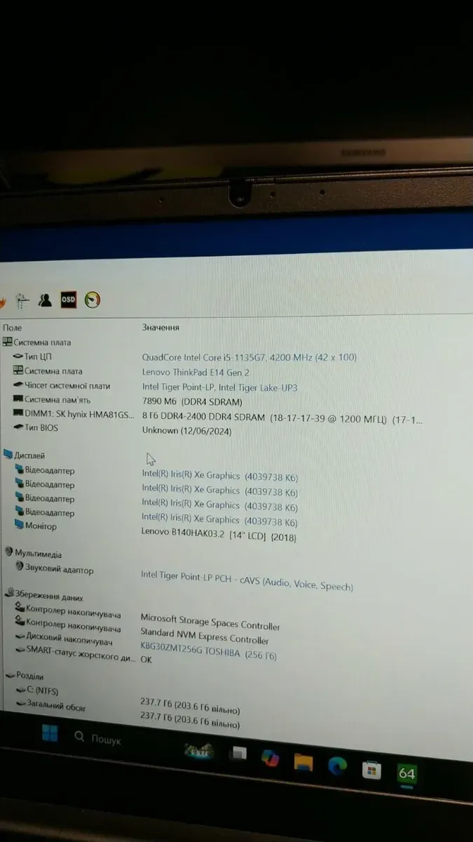 - Процесор: Intel Core i5-1135G7 (4 (8) ядра по 2.4 - 4.2 GHz), 8 MB Smart Cache