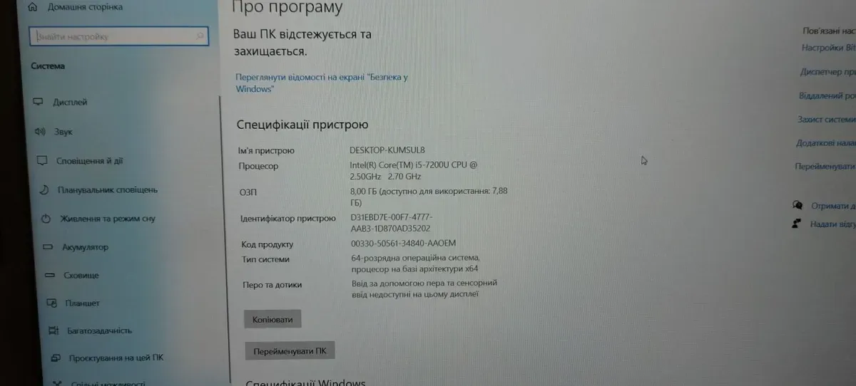 - Процесор: Intel Core i5-7200U (2 (4) ядра по 2.5 - 3.1 GHz), 3 MB Smart Cache