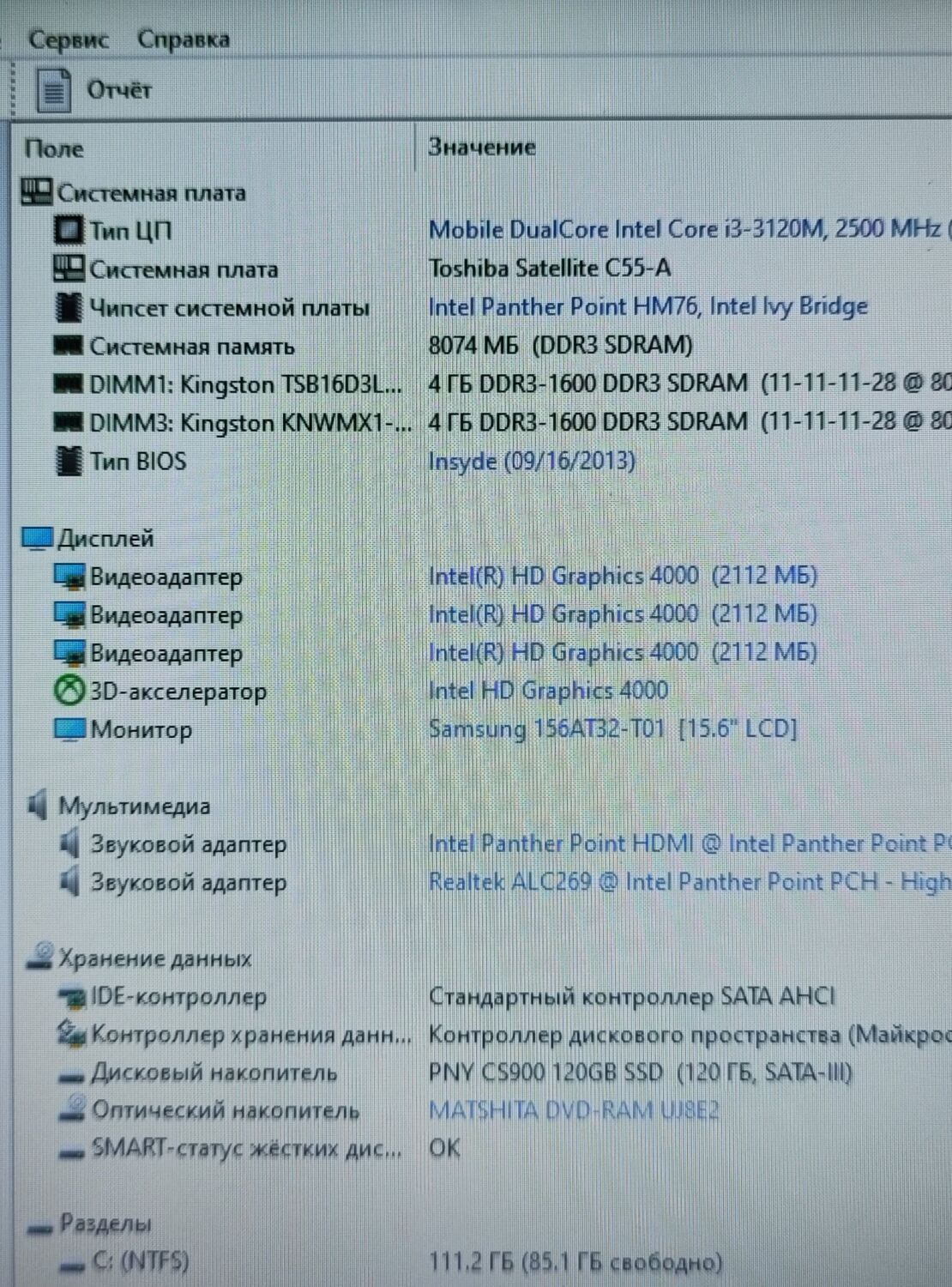 - Процесор: Intel Core i3-3110M (2 (4) ядра по 2,4 ГГц), 3 МБ Smart Cache