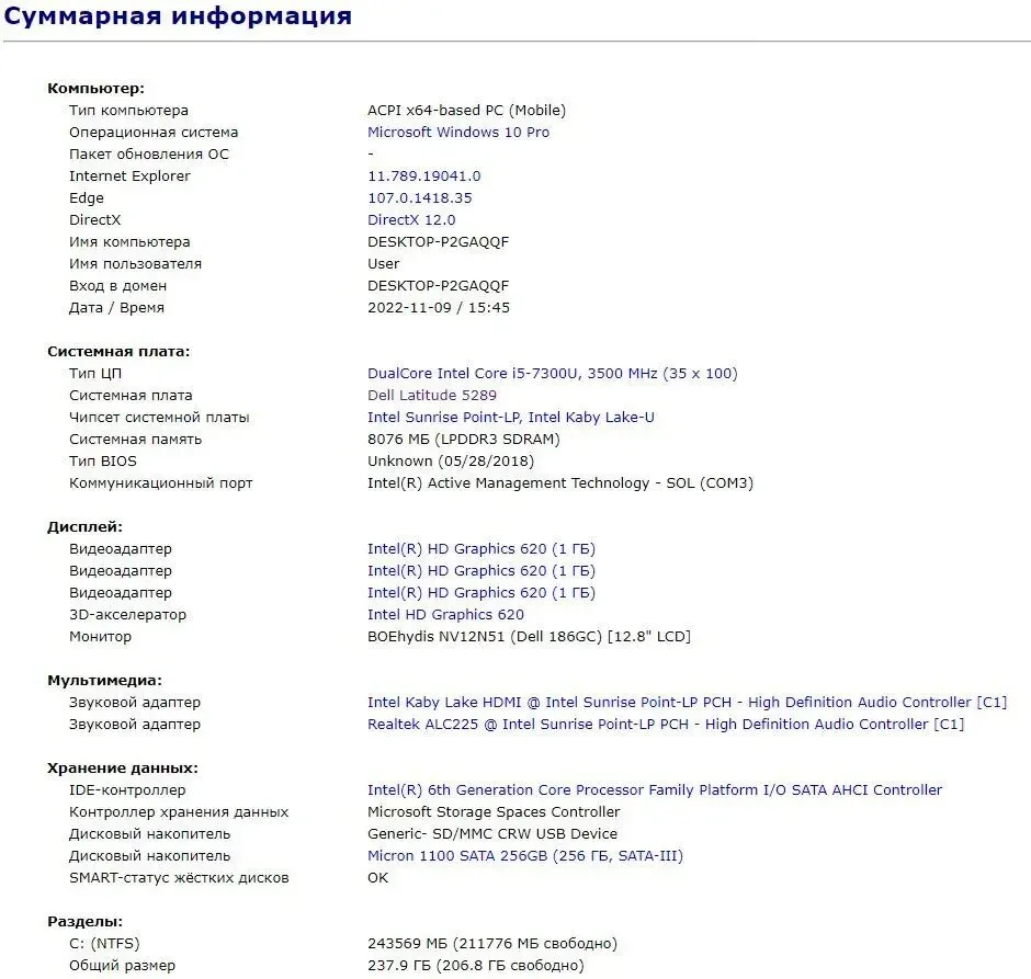 - Постійна пам'ять: 256 GB SSD M.2 (SK hynix SC300B HFS256G39MND-3510B)