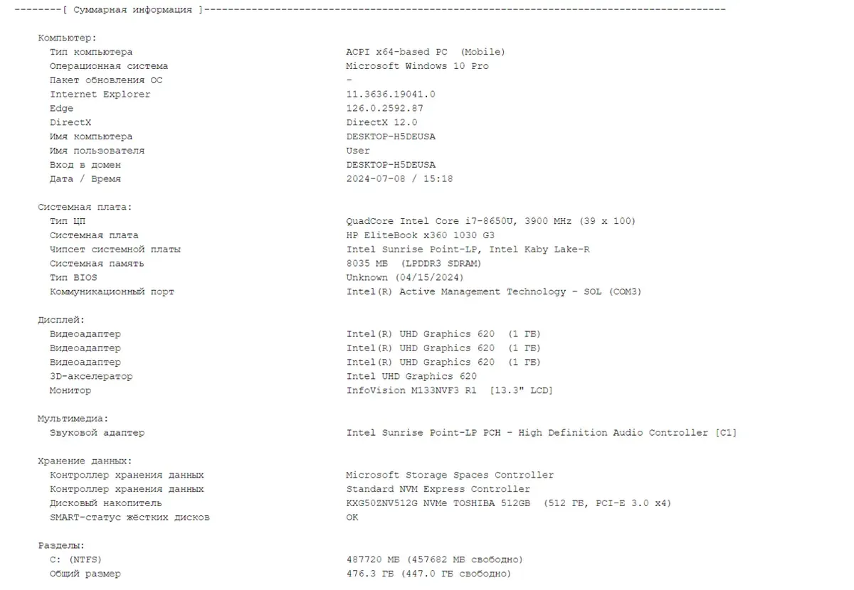 - Процесор: Intel Core i7-8650U (4 (8) ядра по 1.9 - 4.2 GHz), 8 MB Smart Cache