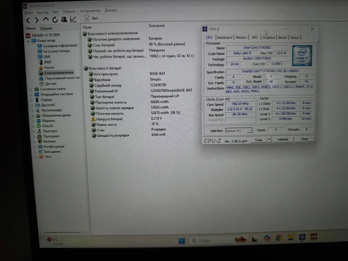 - Процесор: Intel Core i7-8550U (4 (8) ядра по 1.8 - 4.0 GHz), 8 MB Smart Cache