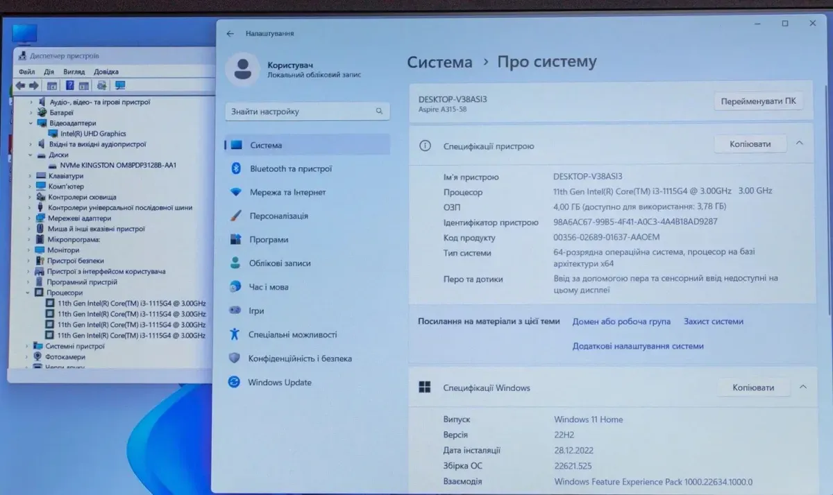 - Процесор: Intel Core i3-1115G4 (2 (4) ядра по 4.1 GHz), 6 MB Smart Cache