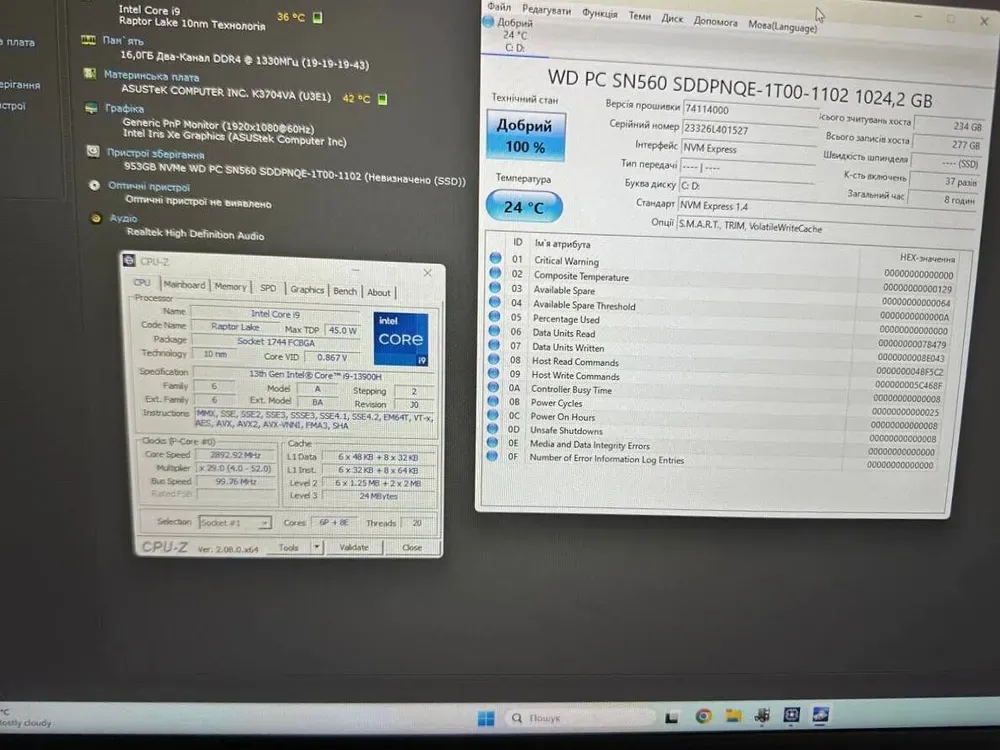 - Процесор: Intel Core i9-13900H (14 (20) ядер по 4.1 - 5.4 GHz), 24 MB Smart Cache
