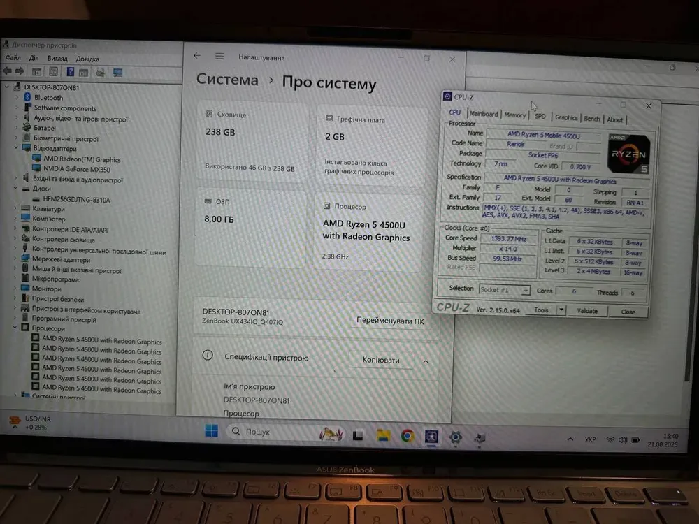 - Процесор: AMD Ryzen 5 4500U (6 ядер по 2,3 - 4,0 ГГц), 8 МБ кеш-пам'яті