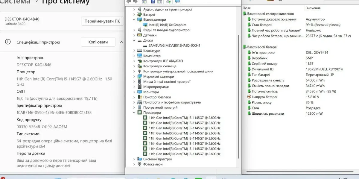 - Процесор: Intel Core i5-1145G7 (4 (8) ядра по 2.6 - 4.4 GHz); Cache Memory 8 MB