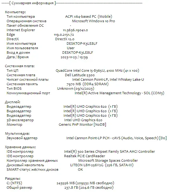 - Постійна пам'ять: 256 GB SSD M.2 (Liteon L8H-256V2G)